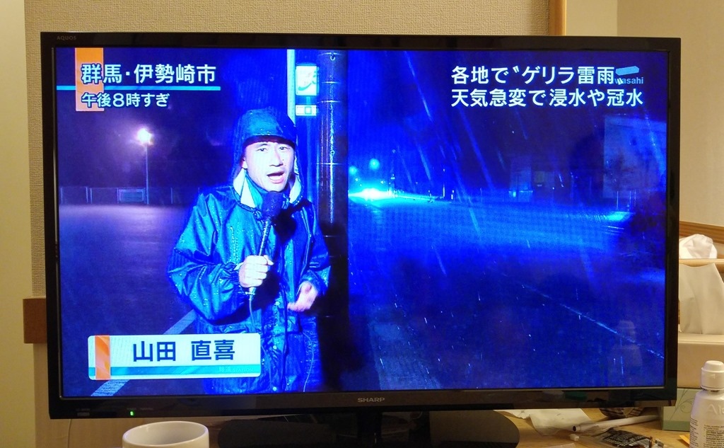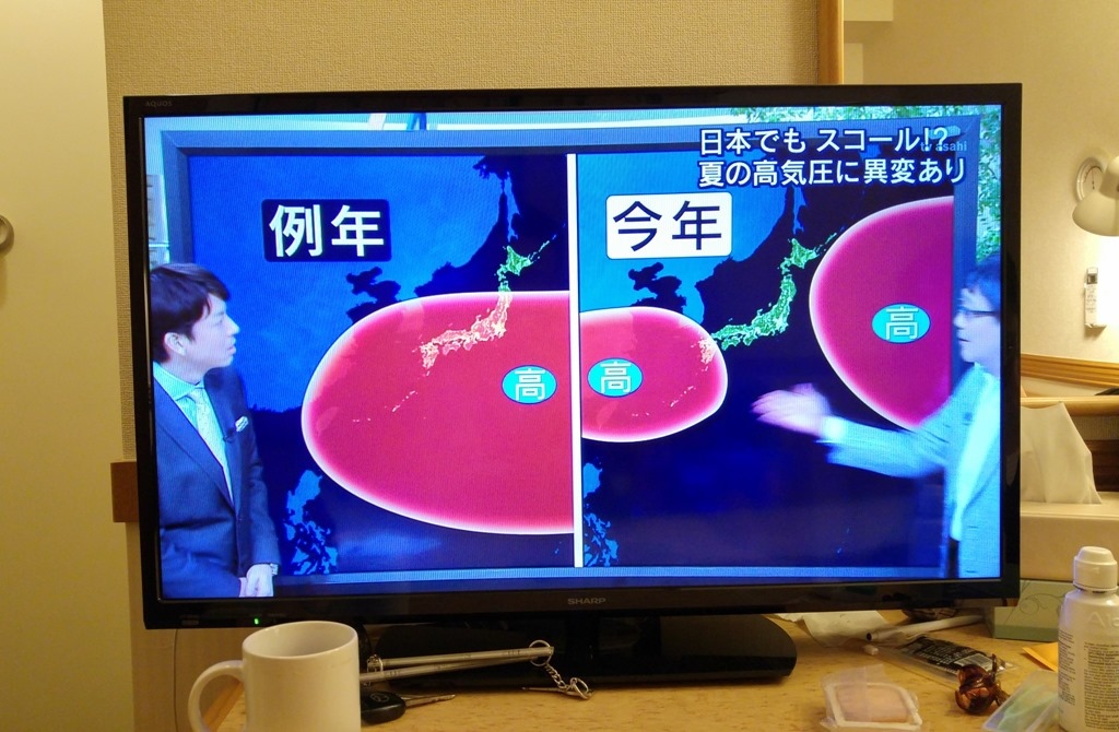 ▲ 進房盥洗休息,電視上正探討著今年夏天日本各地不斷大雨成災的現象。往年高壓壟罩全日本,